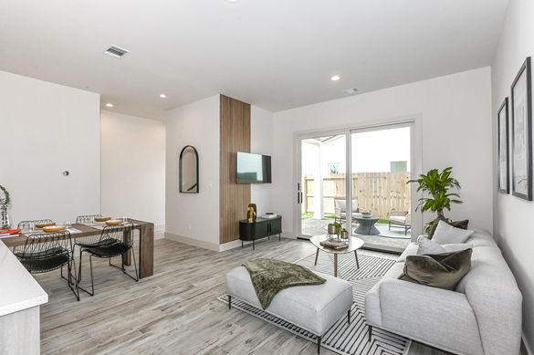 Porcelain tile in entrance, hallway, kitchen, dining, and living area